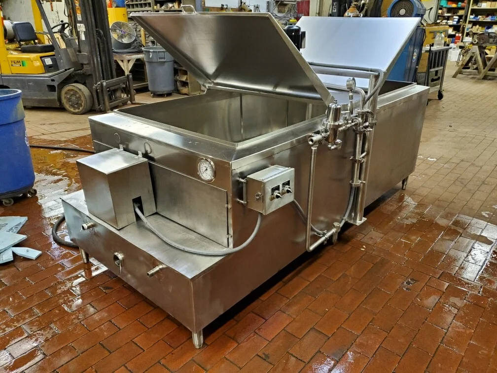 5,000 LB STOELTING END DOOR FINISHING TABLE, 47’LONG X 68”WIDE X 14” DEEP, ALL S/S EXTERIOR, BOTTOM AND LEGS, INCLUDES AGITATOR CARRIAGE AND RAIL WITH DUAL MOTOR AGITATION. SERIAL# 284471-98-2