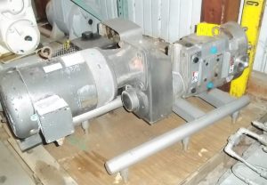 WAUKESHA MODEL 060 U2 S/S POSITIVE PUMP, 3″ TRI CLAMP PORTS, S/N 418037-06 ON BASE WITH 7.5 HP 1760 RPM 230/460 VAC GEAR REDUCER RATIO 6.70:1, 262 SHAFT RPM.