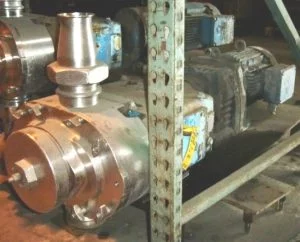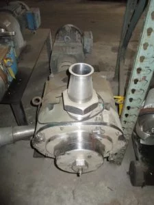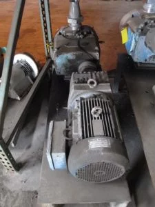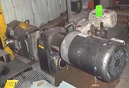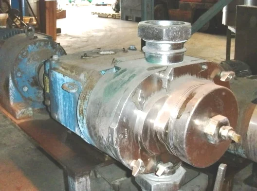 WAUKESHA MODEL U-220 S/S POSITIVE PUMP, TOP INLET, 4″ BEVEL SEAT PORTS, RELIEF HEAD, MOUNTED ON MILD STEEL BASE WITH 10 HP EURO DRIVE PARALLEL GEARHEAD MOTOR, 113 RPM, S/N 108266.